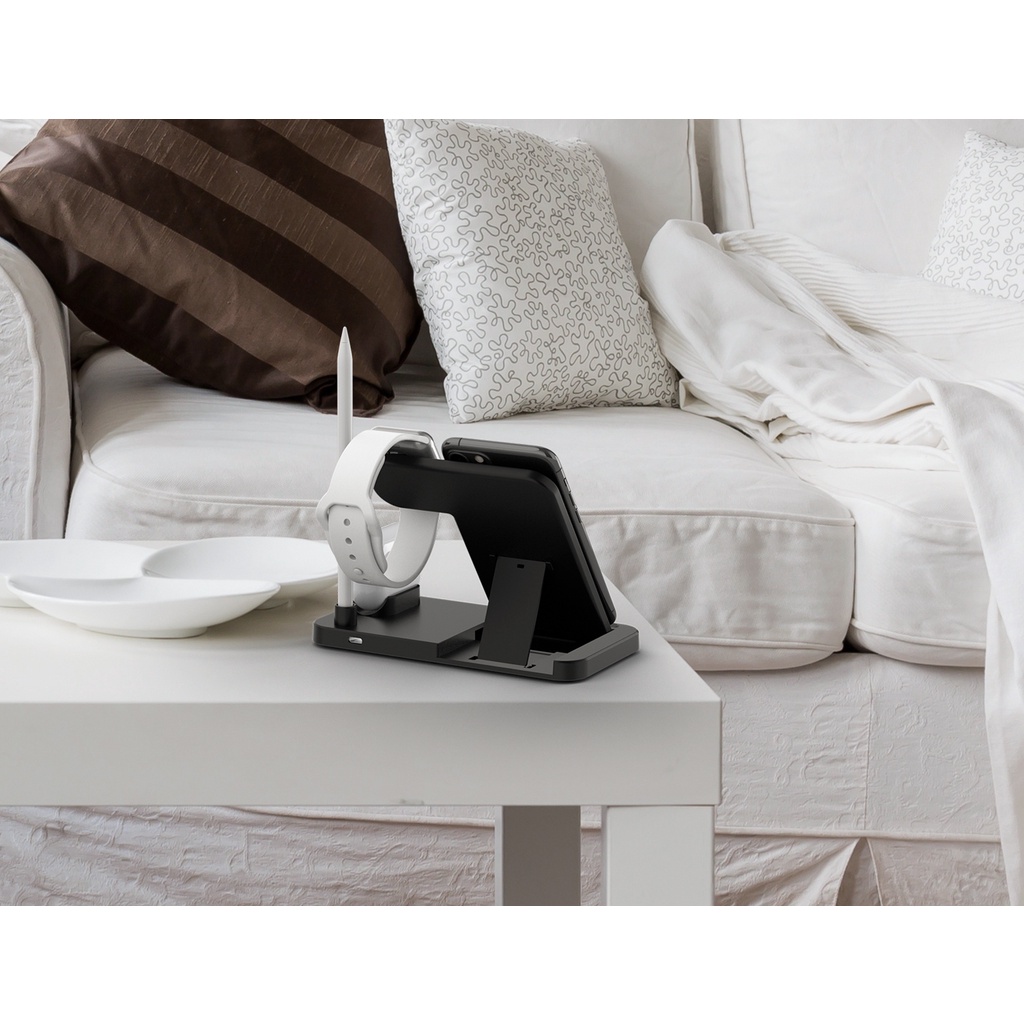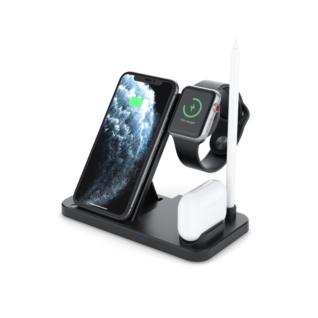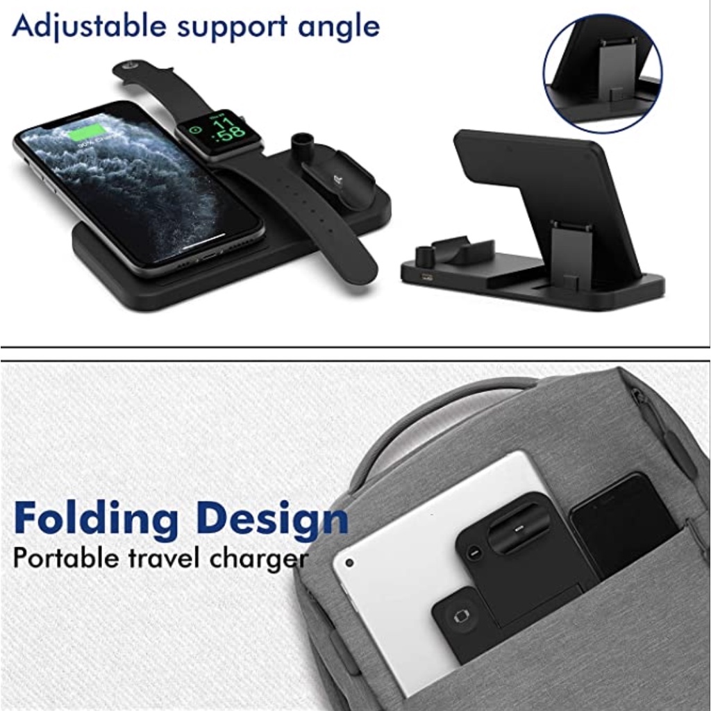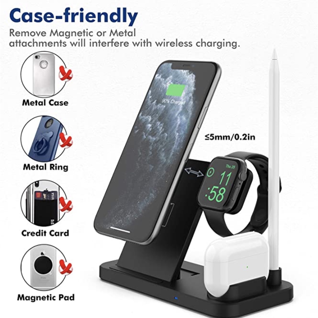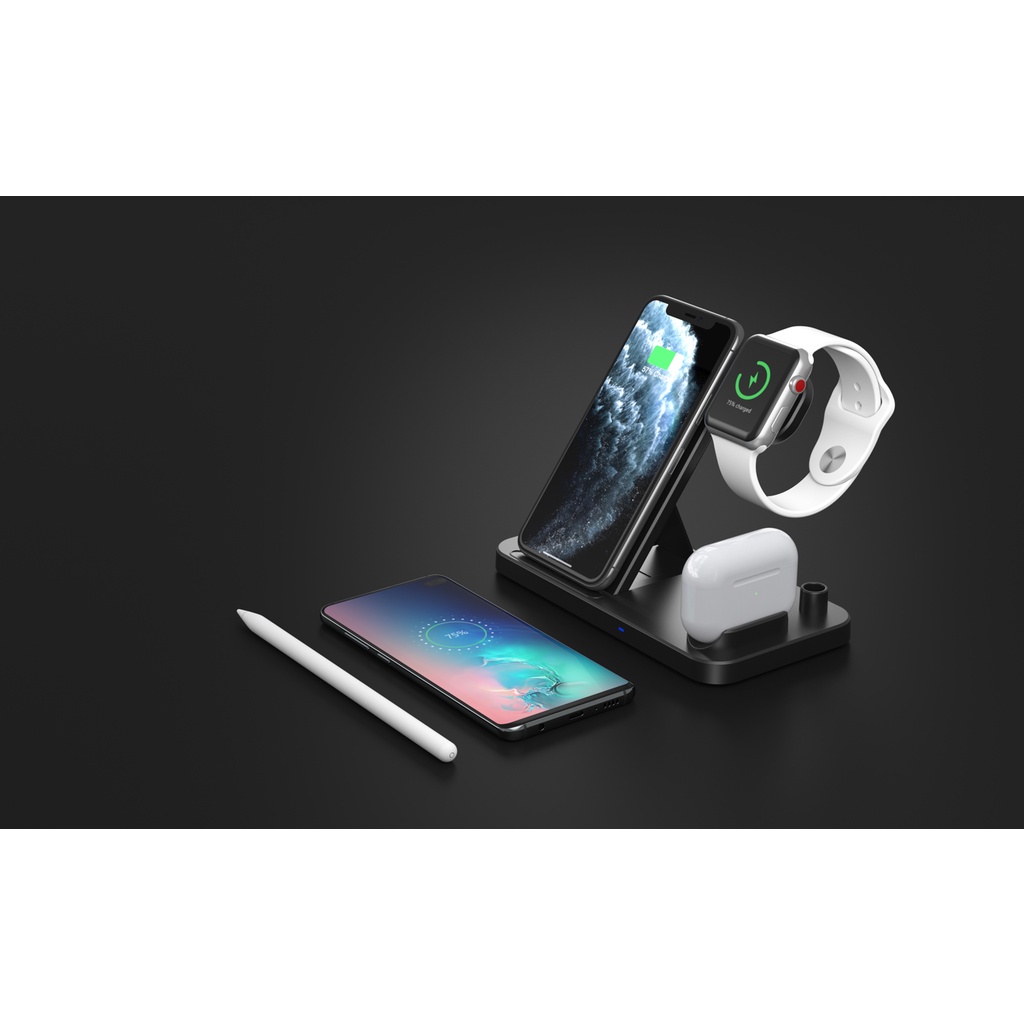 • Specifications:- Material: ABS- Input: 5V/2A, 9V/2A- Output iWatch: 2W- Output Apple Pencil: 2W- Output Airpods: 5W- Output Phone : 5W 7.5W 10W 15(Max)- Color : White/Black- Receiving Distance 2-10mm- Package: 18x15x2.5cm- Packaget Weight: 200Grams- Cable Length 1.2mWhat's in the package?- 1 x 4 in 1 QI Wireless Charging Station- 1 x Type-c USB Charging Cable- 1 x User Manual3 Months Local Warranty*Terms and conditions applied *