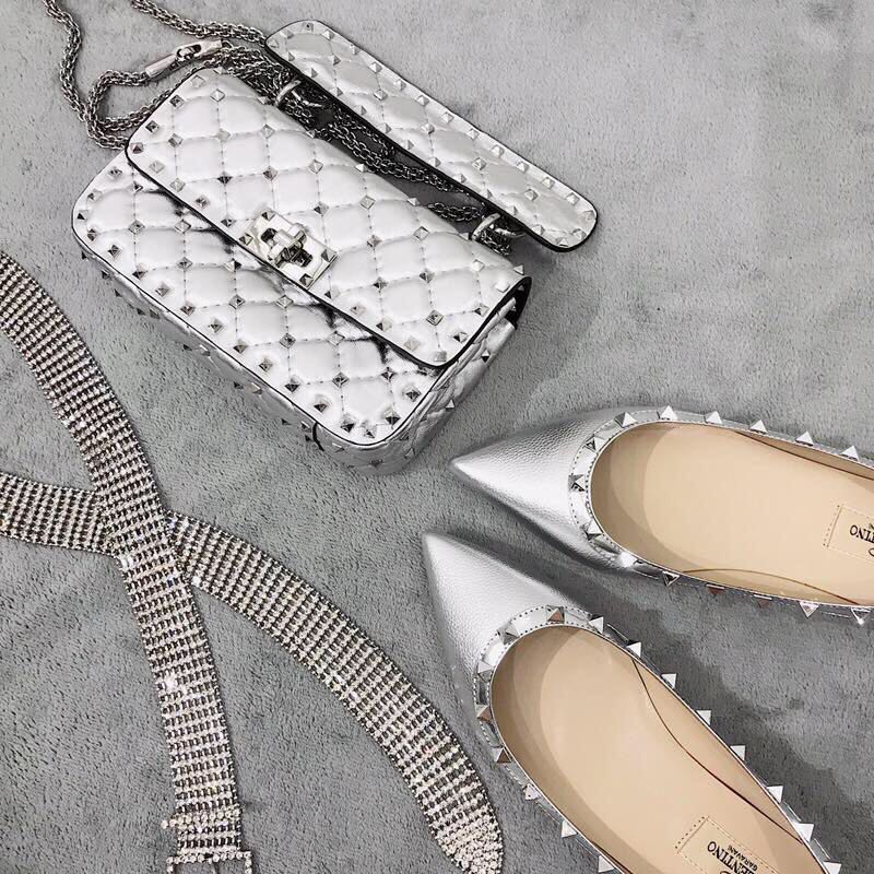 2019 Spring and Summer New Style Silver with Rivets Patent Leather Pointed Cowhide Small High Heel