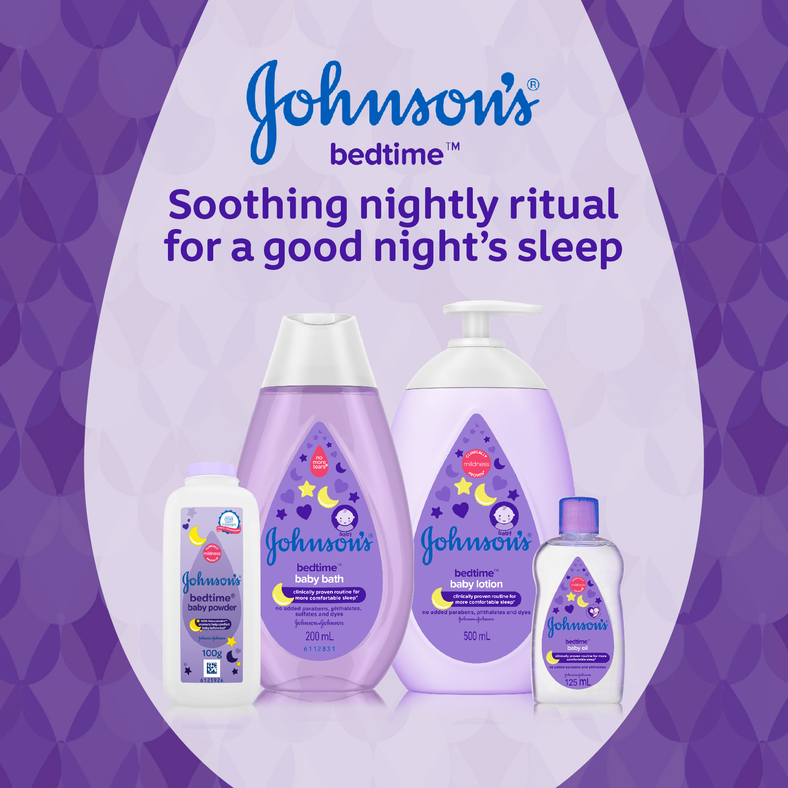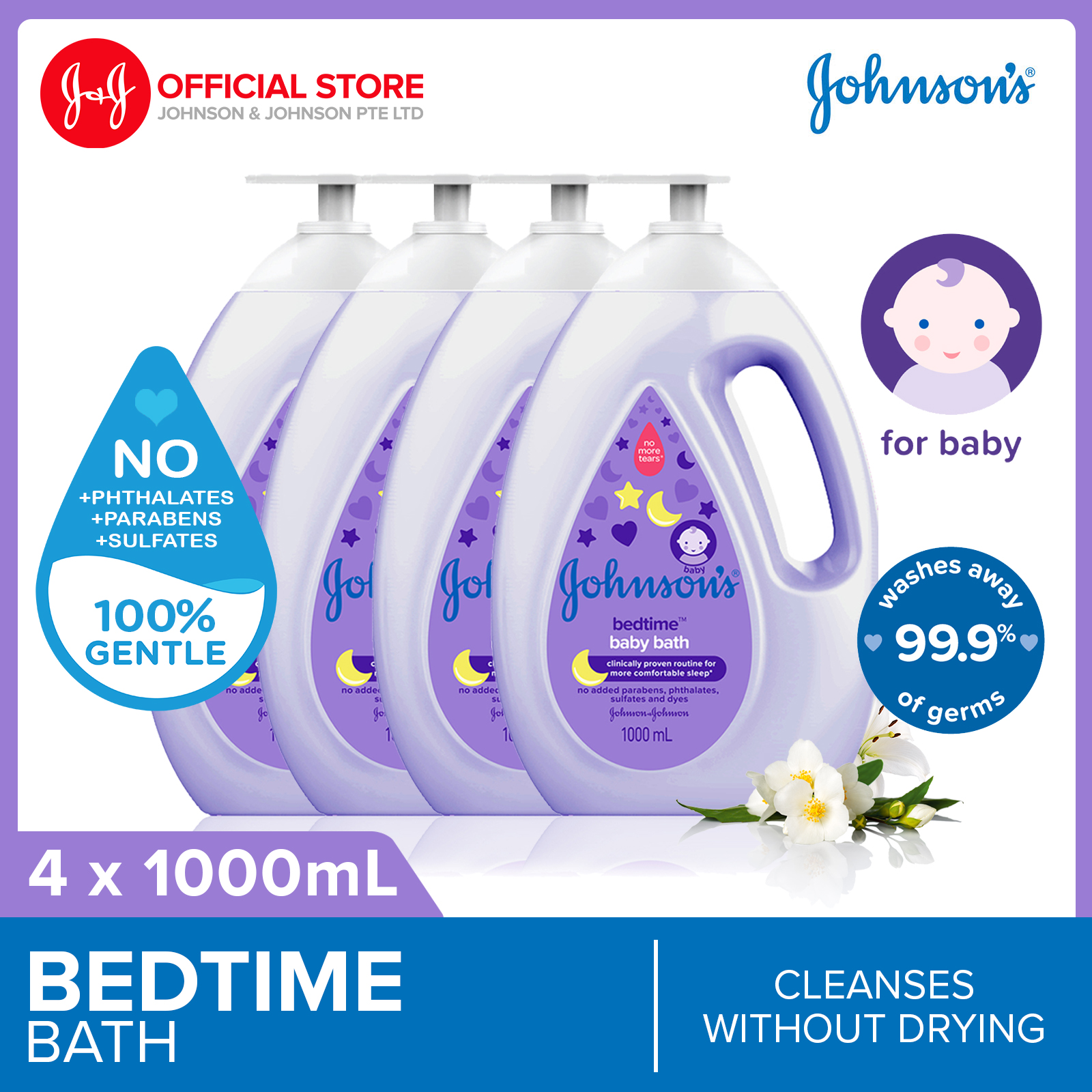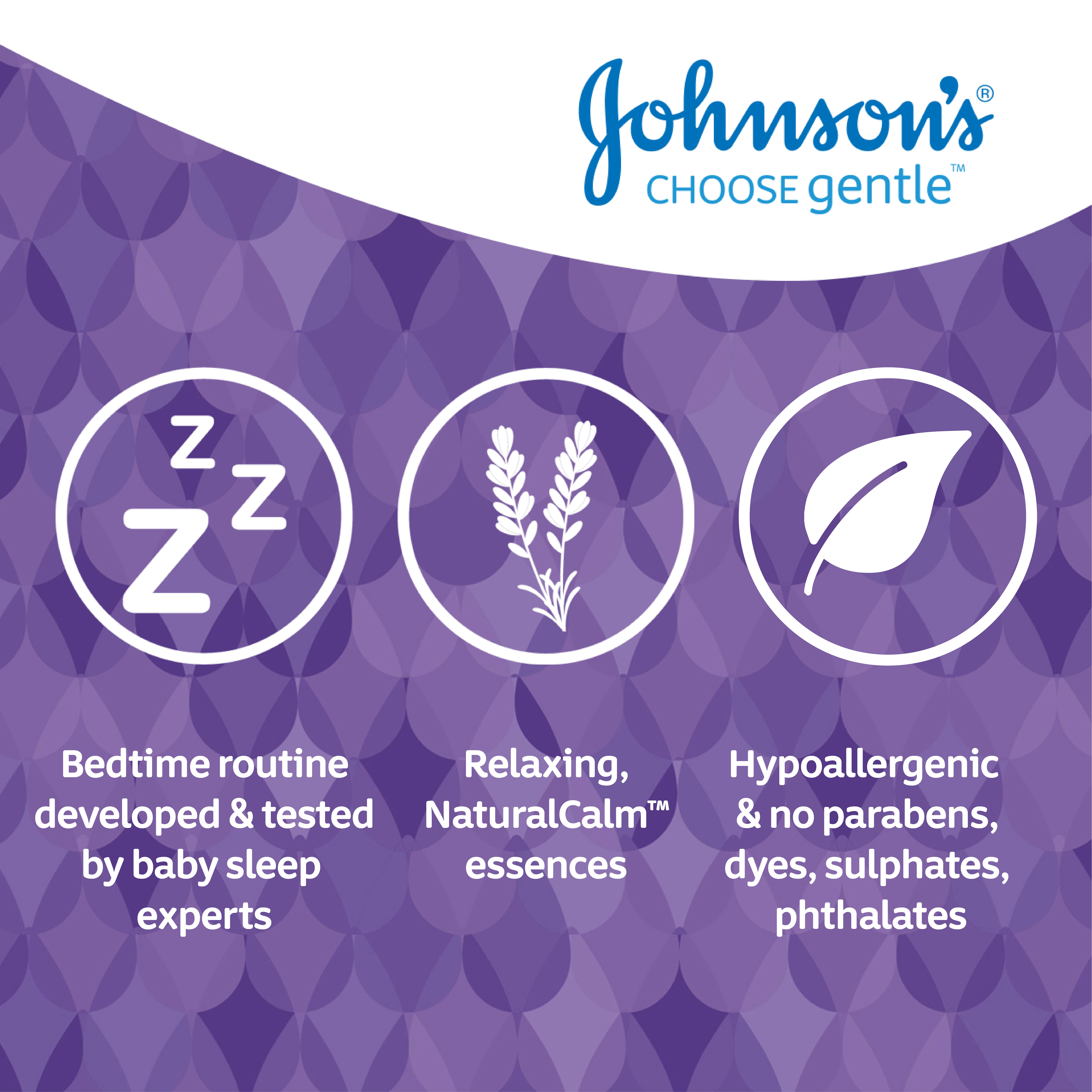 Johnson's® Bedtime™ baby bath with NaturalCalm® essence, clinically proven to help calm and comfort baby before sleep*(Did you know?) A soothing nightly ritual can help send your growing baby to dreamland. Our product compliments your baby’s bedtime routine for a comfortable night’s sleep.*Based on baby’s bedtime routineBenefits of productClinically proven to help calm and comfort baby before sleep**Based on baby’s bedtime routineBenefits of IngredientsWith NaturalCalm® aroma of Jasmine and Lily that calms baby before sleepHow-to-UseRemove seal to open. Wet baby's body with warm water, apply bath with your hand, wash cloth or puff, gently lather & rinse.Possible RegimeFor best bonding experience, we recommend that you cleanse your baby with JOHNSON'S® Baby Bath, moisturize with JOHNSON'S® Baby Lotion and then freshen her with JOHNSON'S® Baby Powder