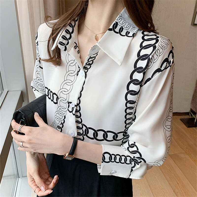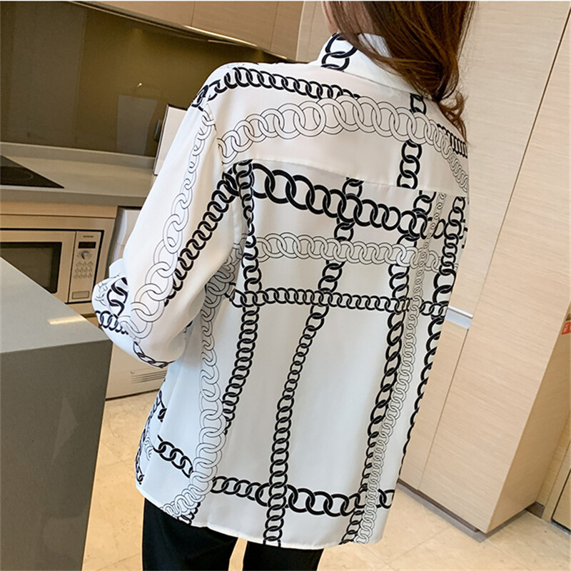 Loose Shirt Women Long Sleeve Fashion Blouse Printed Chiffon Polo Collar Korean Top Lady Clothes