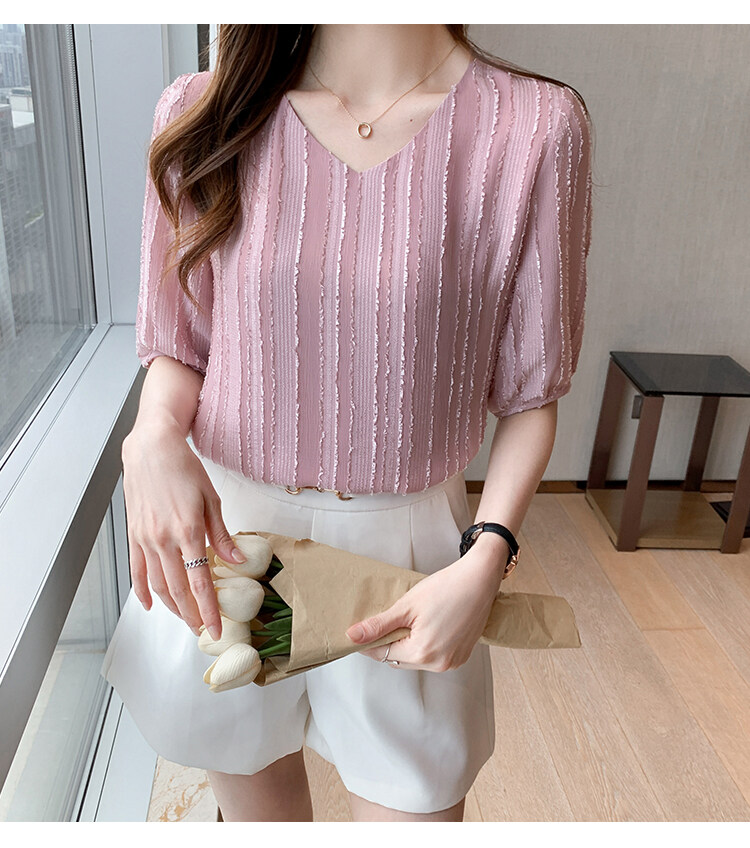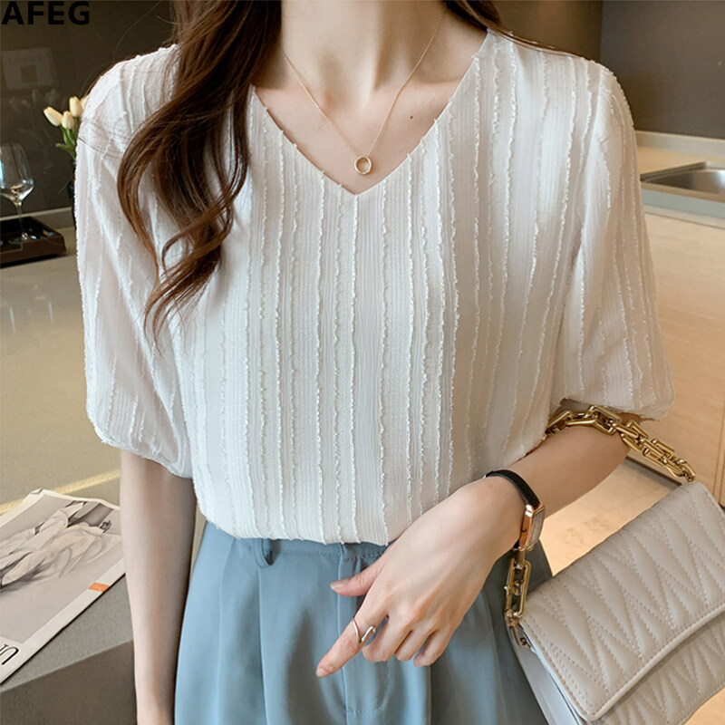 AFEG new Korean style V-neck fashion loose all-match chiffon short-sleeved blouse for women
