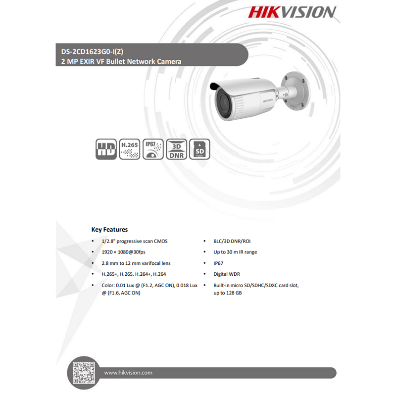 Hikvision DS-2CD1623G0-IZ 2MP EXIR Varifocal Bullet CCTV Network IP Camera