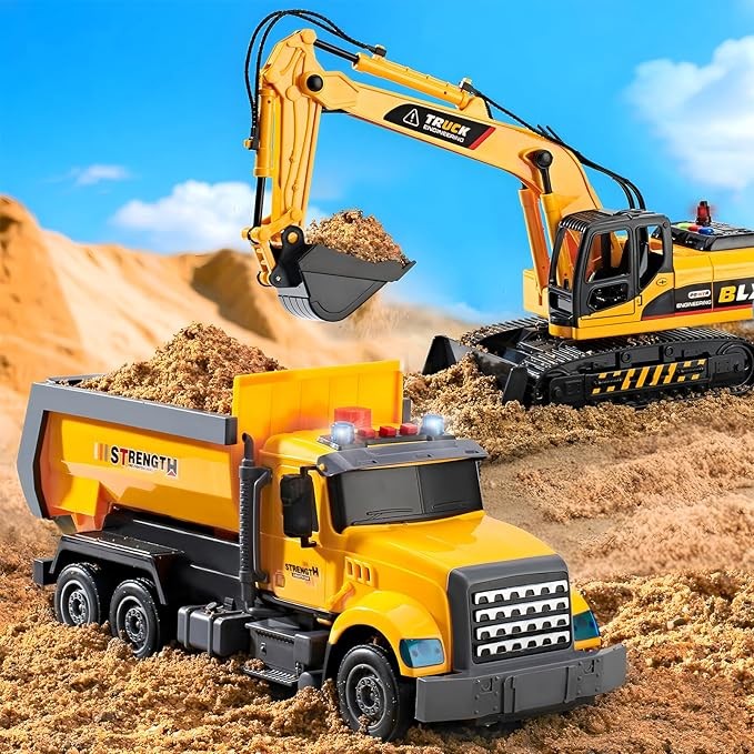 • Interactive Features: The excavator has a 360° rotating cab and a manipulable digging arm via the side lever, enabling realistic scooping. the dump truck allows kids to lift and lower the rear bed by Continuously press the up button on the top of the car and the down button on the fuel tank position, and it comes with 20 plastic stones for loading and unloading action.