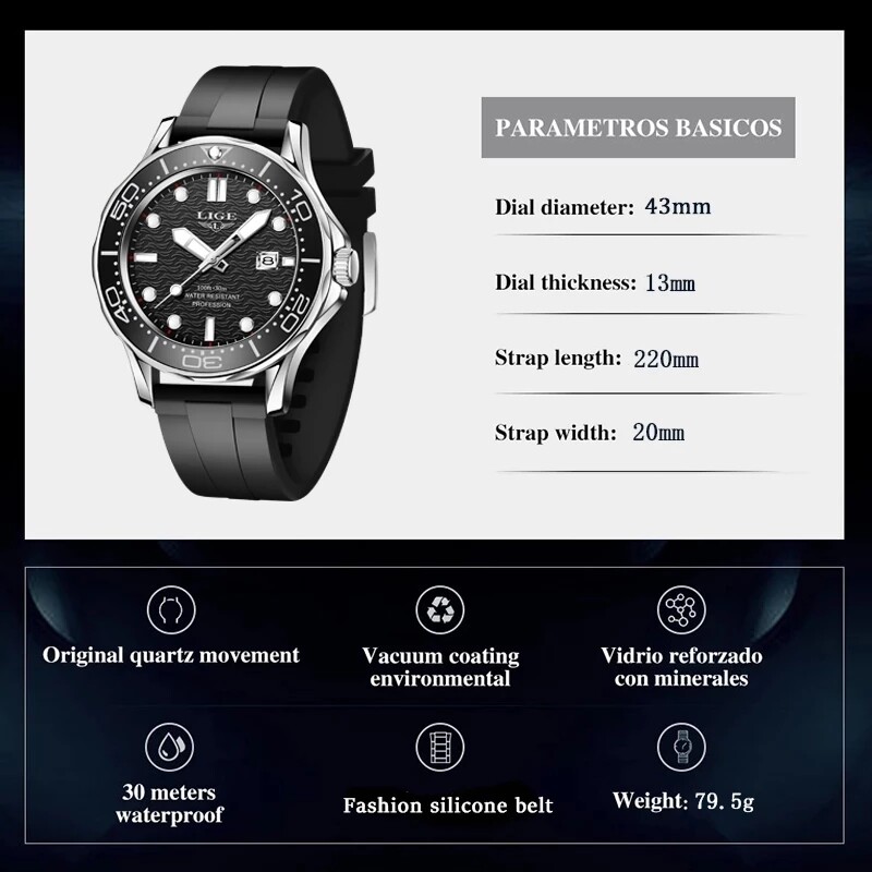 LIGE Sport Diver Watches For Men Stainless Steel Waterproof Date Clocks Men Watch Military Quartz Watch + Box