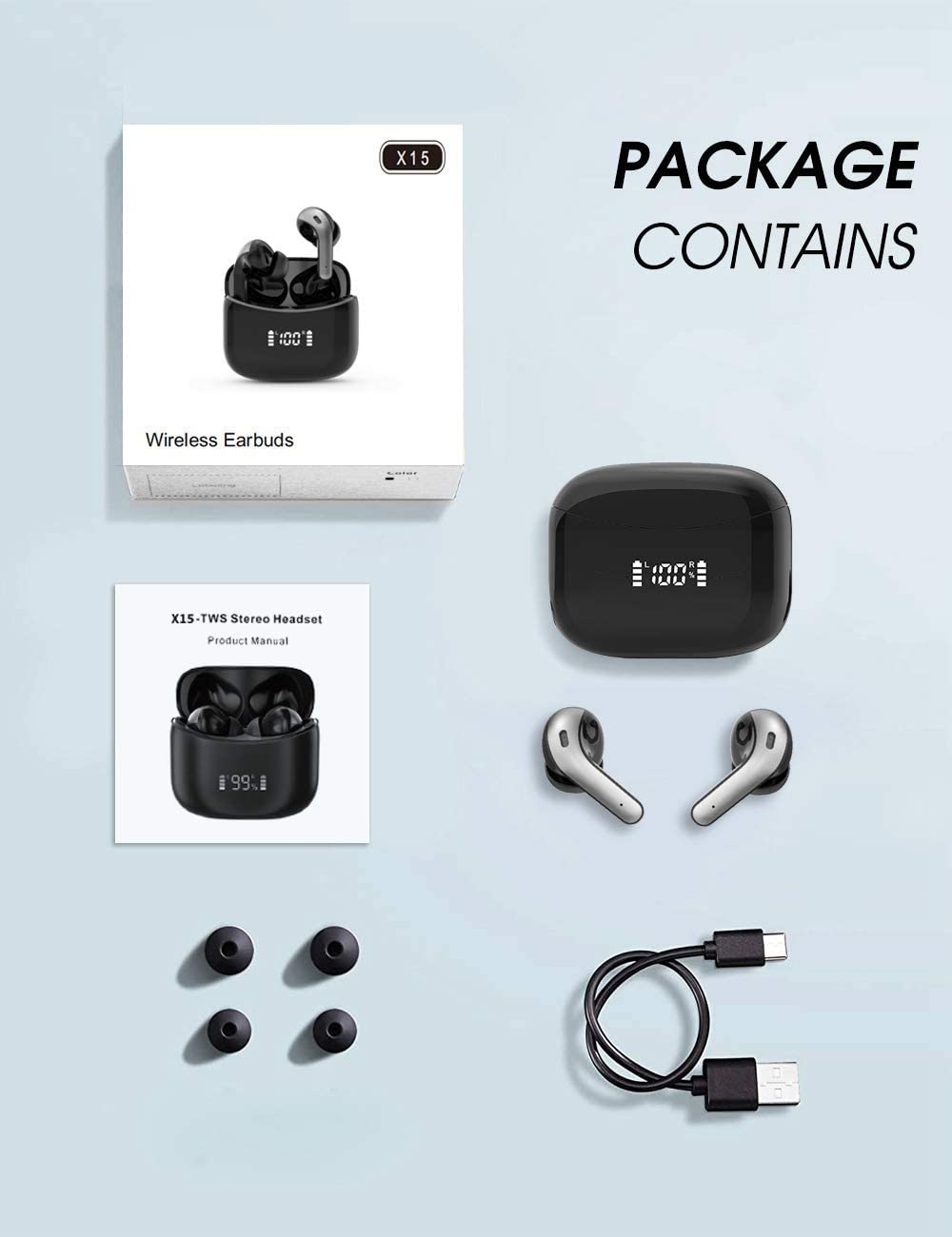 【TOP 1】【2022 NEW】COTIN X15 Wireless Earbuds, Bluetooth Headphones with Microphone, IPX5 Waterproof, 35H Playtime, High-Fidelity Stereo Earphones for Sports and Work