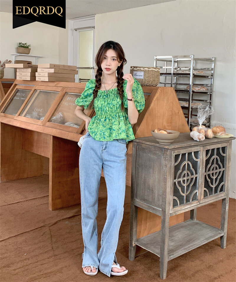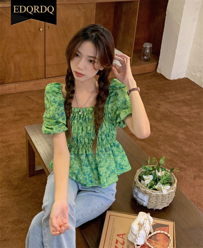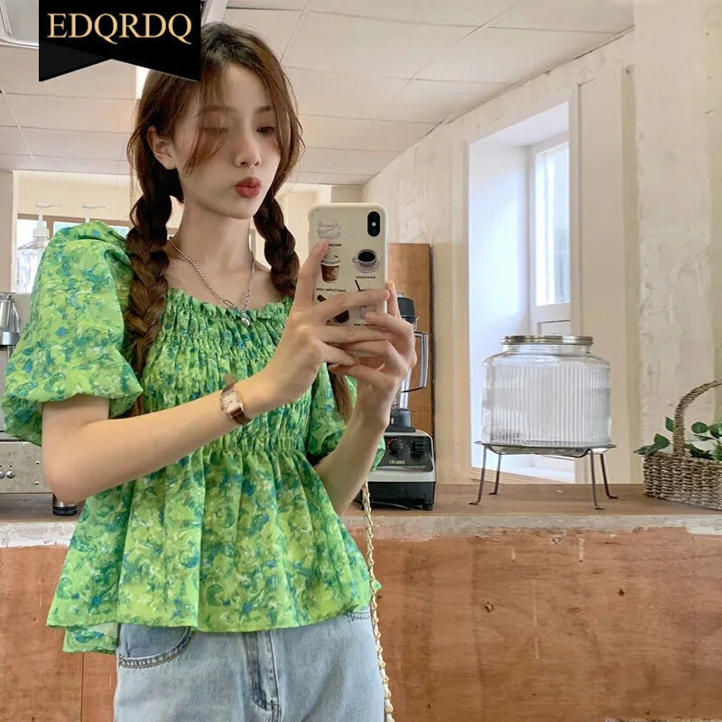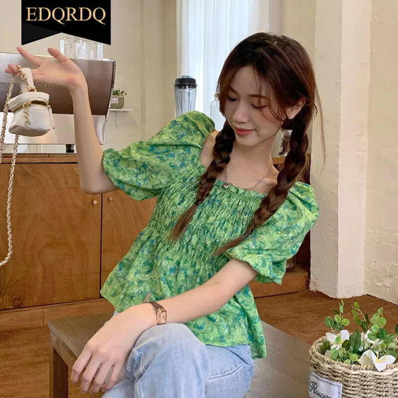 EDQRDQ Floral Off Shoulder Blouses Chiffon Summer Puff Sleeve Fashion Shirts Tops