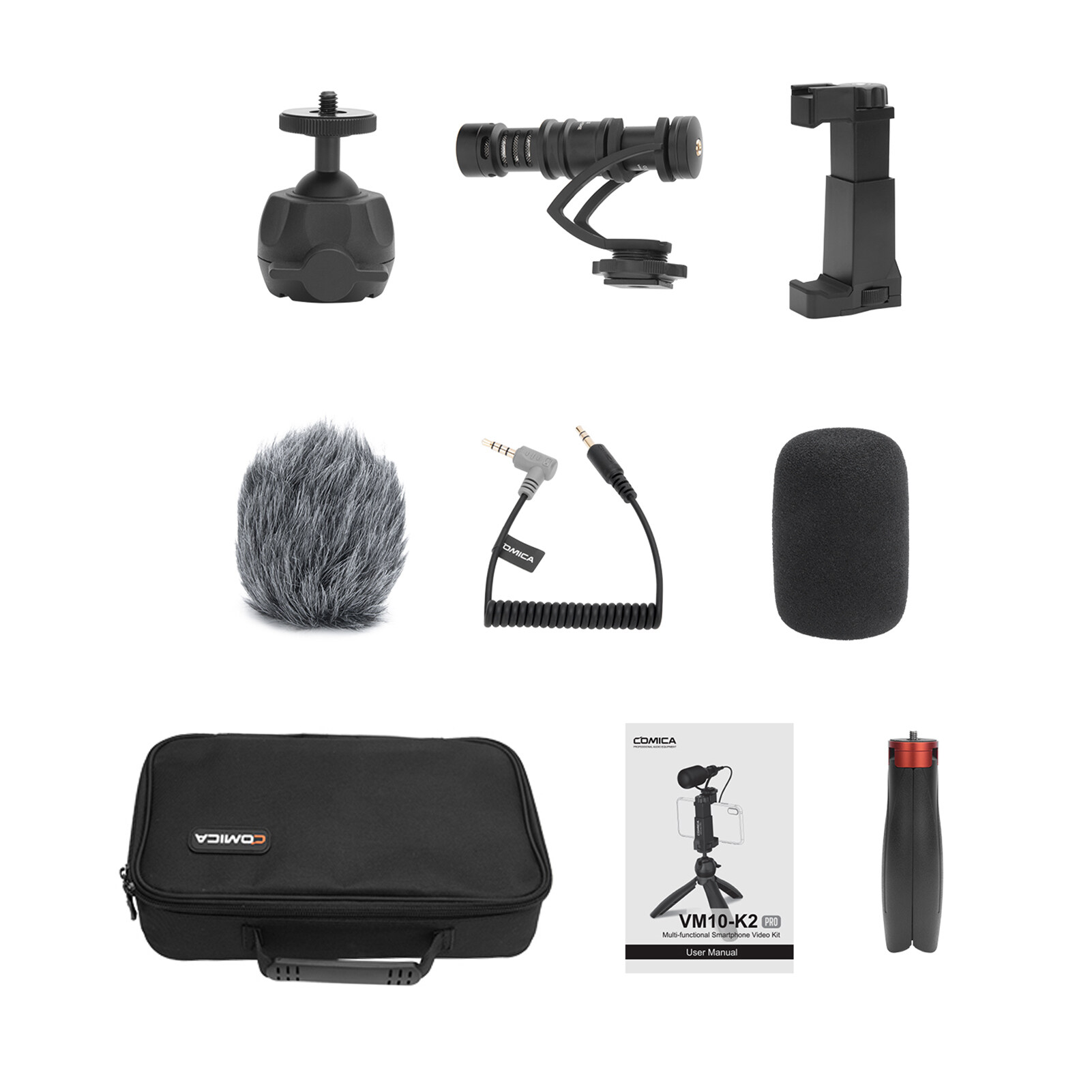 COMICA CVM-VM10-K2 Pro Multi-functional Smartphone Video Vlog Kit with Cardioid Microphone Ball Head Tripod Phone Holder 3.5mm TRS to TRRS Cable Foam Fur Windshield Carrying Bag