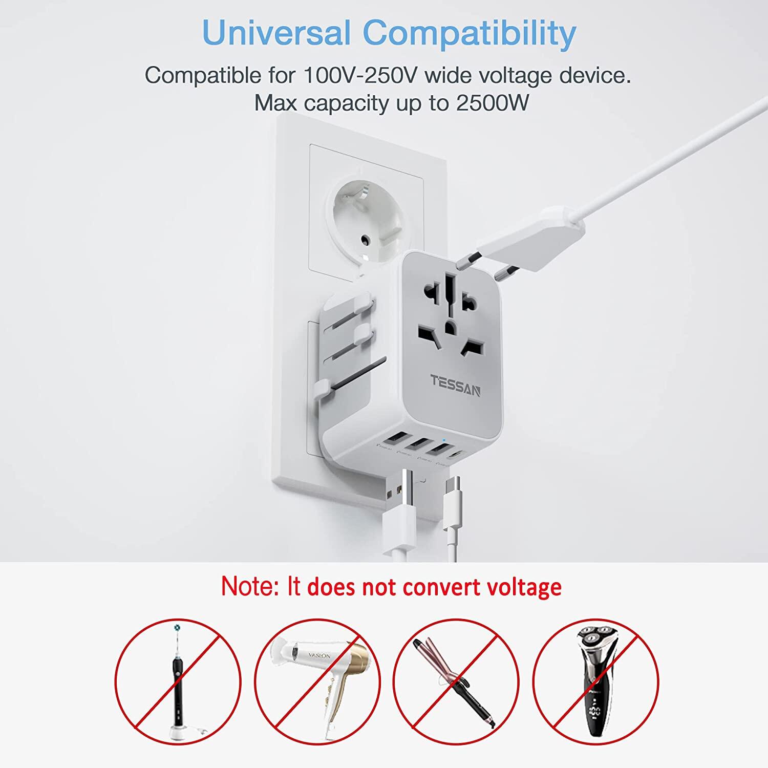 Universal Adapter Plug PH/US/AU/EU Adaptor Socket Travel Charger with 3 USB Ports+(1 USB C),TESSAN International Travel Adapter Universal Adaptor All in One Worldwide EU Adaptor Universal Socket for E