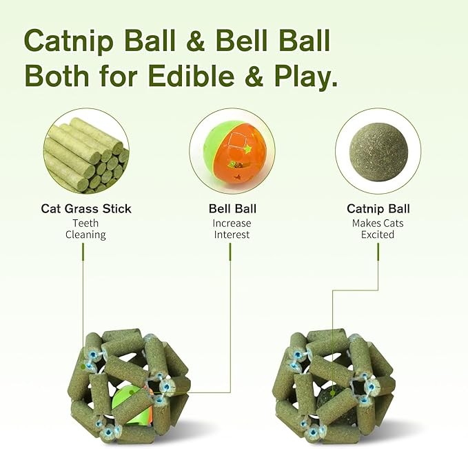 Cat Toys,2 Pcs Cat Grass Stick Cage Balls & Bell Ball,Cat Toys for Bored Indoor Cats,Safe Teeth Cleaning Cat Toothbrush,Cat Chew Toy for All Breeds